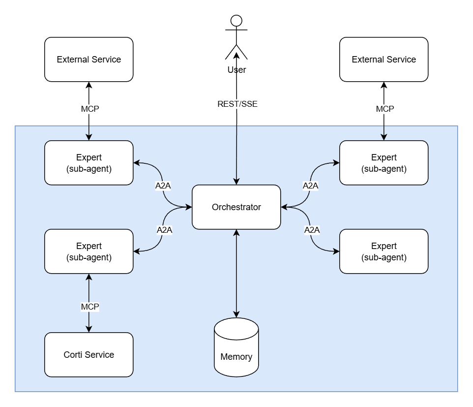 This page visualizes the system architecture of the Corti Agentic Framework. Please review the full API specification for details.